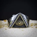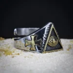 Cette bague au design sculptural, allie l’esthétique épurée d’une pyramide à des motifs sacrés comme la croix et l’œil de la providence. Forgé dans un mélange de métaux gris et dorés, elle dégage une aura de profondeur et de sagesse symbolique. Porter comme un talisman, cette bague unique apportera une touche mystique et tendance à toute tenue.