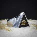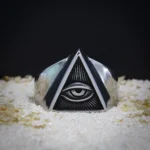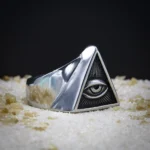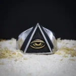 Cette bague, d’une apparence mystique, est présentée ici avec un motif au centre évoquant le concept de l’œil de la providence ou de la surveillance. Son design géométrique lui confère également une esthétique universel nous rappelant certaines civilisations hélas disparu, mais qui continu a nous émerveillé par ça symbolique forte et son sens caché.