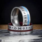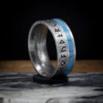 Anneau avec insertion rouge ou bleu, gravé de runes ancestrales. La bande centrale offre un jeu de lecture runique, alliant mystère et élégance dans un design entre glace et lave.